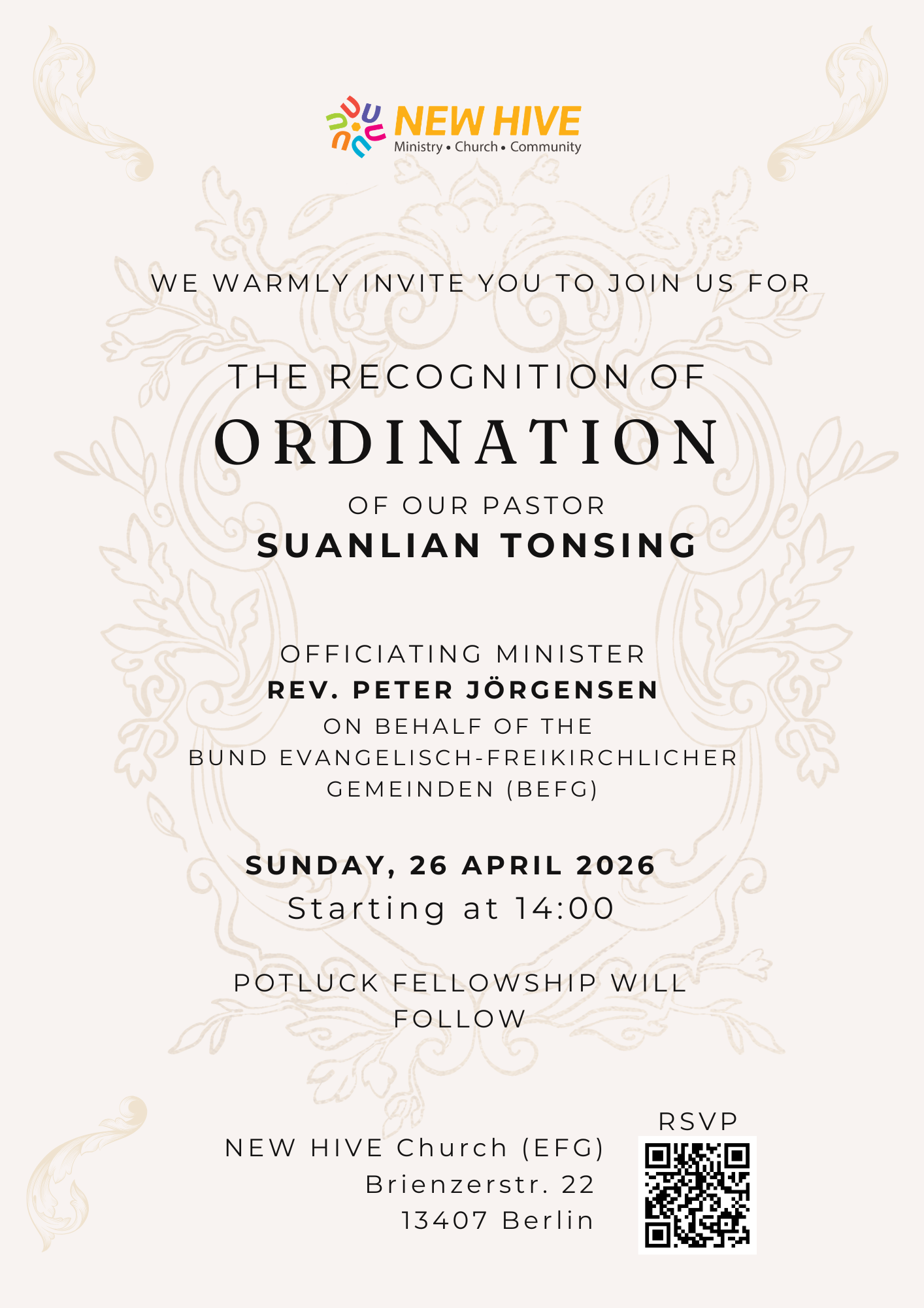 Date 26 Apr 2026 Time 2:00 pm - 4:00 pm Accreditation to Ordination of Pastor Suanlian RSVP link to Google Form Share this event + Add to Google Calendar + iCal / Outlook export 00 days 00 hours 00 minutes 00 seconds