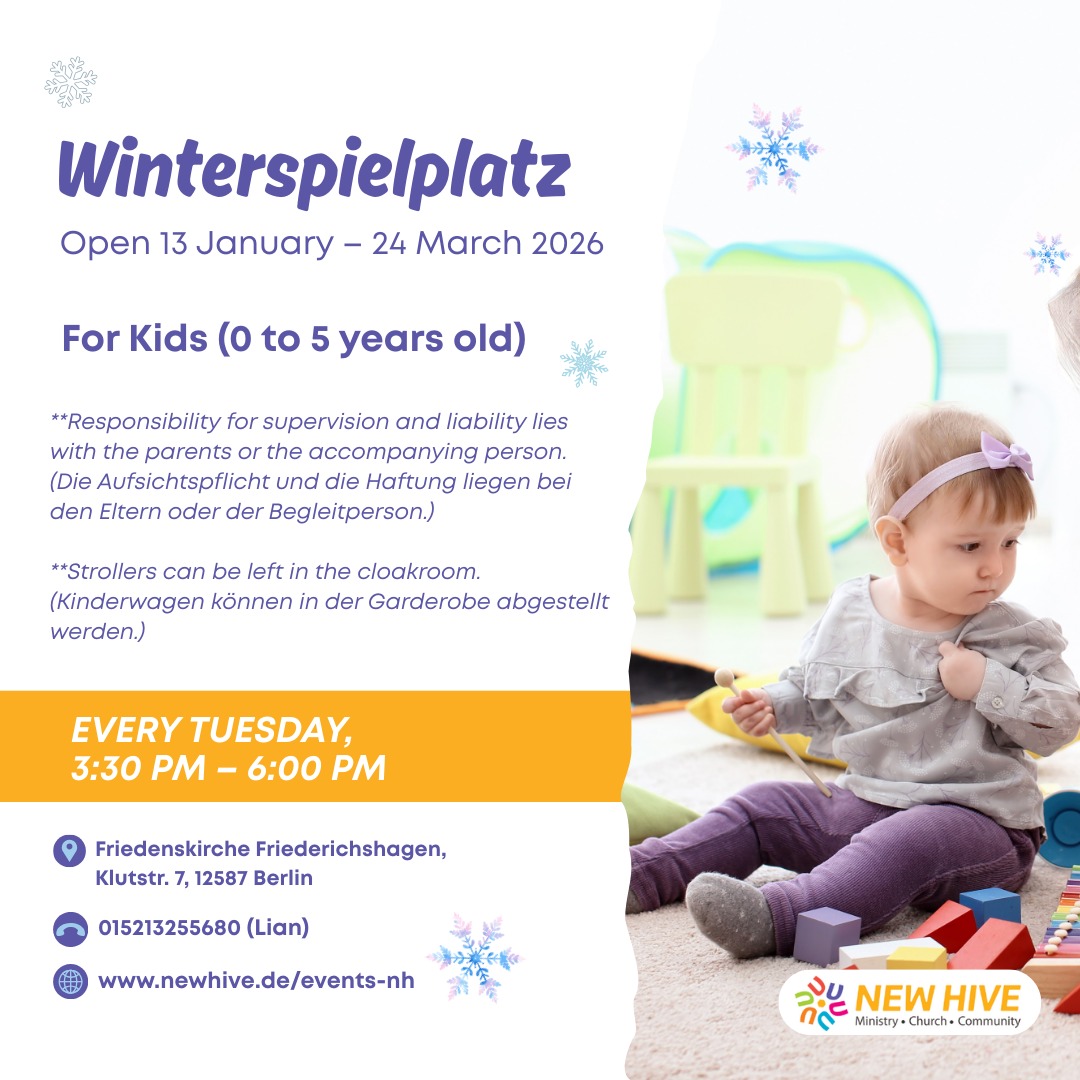 Date 13 Jan 2026 Time 3:30 pm - 6:00 pm Winterspielplatz Share this event + Add to Google Calendar + iCal / Outlook export 00 days 00 hours 00 minutes 00 seconds